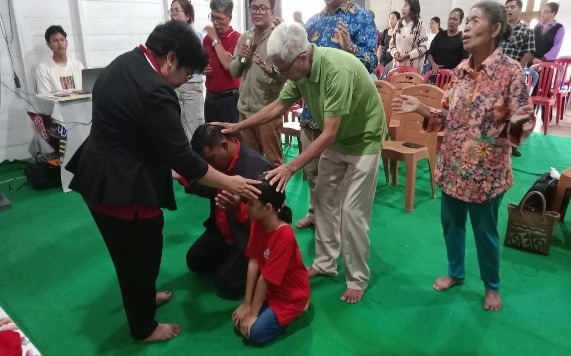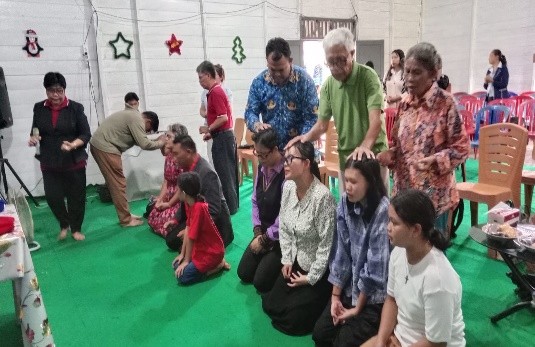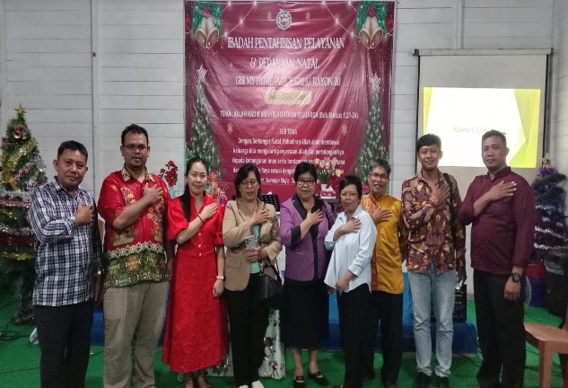 Pengerja jemaat lokal didoakan oleh Ketua BPD Barito dan pejabat GBI yang hadir.